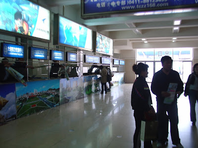 Ici sur la photo, l'arrivée à Dalian avec les rabatteurs derrière un comptoir qui crient pour te donner des pubs sur hôtels, restaurants, parcs...