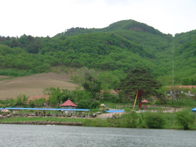 Pratiquement aucune construction de l'autre côté quelques cheminées d'usine en arrière-plan, des postes militaires réguliers observant le fleuve et quelques agriculteurs pêcheurs sur le bord du fleuve. Mais rassurez-vous on s'amuse aussi en Corée du Nord puisque l'on peut voir une magnifique roue d'un Luna-park style...