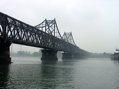 On passe aussi sous le pont coupé en son milieu par les bombardements américains lors de la guerre de Corée. Guerre qui nous est présentée par nos guides et amis chinois comme une guerre entre la Corée et les États-Unis. La Chine ne s'étant pas officiellement engagée mais ayant envoyé de nombreux volontaires sous les ordres du général Lin Piao dont la statue gigantesque orne le début du nouveau pont de l'amitié sino coréenne.