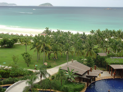 On est dans un superbe hôtel en face de la plage de la bai Yalong dans la ville de Sanya. Cette plage de sable blanc fait 7 km de long... De belle vague sont au rendez-vous, ici c'est la saison des pluies et typhon meme si pour le moment un seul orage.